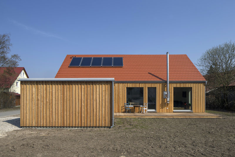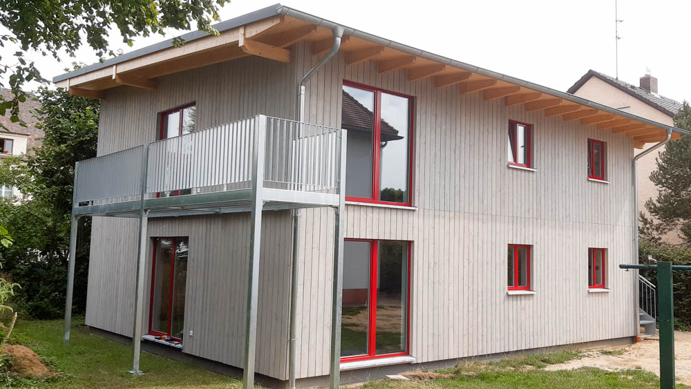 Holzhaus in Holzrahmenbauweise etwas anders: Aussen komplett schwarz: Im Einzelnen Holzschalung Fichte mit Wechselfalz. Holzalufenster Aluschale schwarz, sichtbare Blechteile wie Regenrinnen, Fensterbänke Sockelbleche etc.: schwarz. Dacheindeckung: Biber geradschnitt schwarz engobiert. Anstatt der oft verwendeten OSB Platten als Aussteifung und Dampfbremse kamen bei diesem Bauvorhaben die von Fundermax entwickelten FunderPlanplatten ( mit NaturePlus Gütesiegel) zum Einsatz.